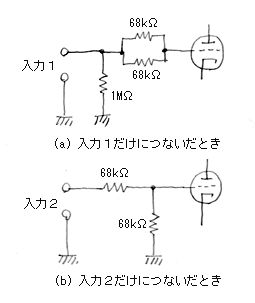 ここでは、ギターのシールドを突っ込むアンプの入力回路について簡単な説明をしておこう。製作編のアンプの回路では図のようにきわめてそっけない入力回路を使っている。入力は一つだけで、入力ジャックの後ろに、グリッドに並列に1MΩの抵抗が入っているだけである。