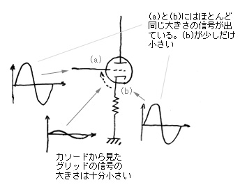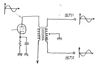 それでは、今度は右側の真空管に目を移してみよう。グリッドは接地されていてゼロである。しかしカソードは先に説明したように信号電圧でゆれている。と、いうことは、右側真空管のカソードを基準としたグリッドの電圧というものを考えると、図のようにちょうど位相が反転した信号が加わっている、ということになる。そして、右側真空管も普通の電圧増幅回路の形をしているので、この反転した(カソードに対する)グリッド電圧が増幅され、出力2に増幅された信号が出てくる。と、いうわけで、出力2には出力1と位相がちょうど反転した信号が出てくるのである。