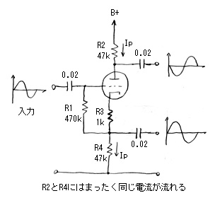 上述の原理をよくよく見ると分かるが、R6の両端の信号を右側真空管で増幅して出力2が出てくるわけだから当然といえば、当然である。