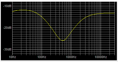 ギターアンプのトーンコントロール回路で何といっても定番なのが下の左の図のようなFenderの回路である。さて、常識的に考えると、これら3つのツマミをすべて真ん中にしたとき周波数特性がフラットになり、それを基準として3つのツマミをプラスマイナスに振ることで高中低域の周波数特性を上下できると思うのが自然であろう。ちょうどグラフィックイコライザーのノリである。しかし、実はこの回路ではそうなっていない。この回路でツマミを全部真ん中にすると下の右の図のような周波数特性になる。