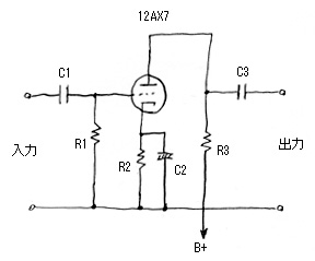このように、ざっと考えてもいくつもの要因が関係しており、こうしないといけない、という決まりは無く、各々の妥協点の適当なところに落ち着くわけだ。下の図の回路では、次段のグリッドリーク抵抗R4が470kΩで、12AX7の内部抵抗は規格表から80kΩ(プレート電圧が100Vのとき)と書いてあるので、負荷抵抗R3を470kΩと80kΩの間の、たとえば180kΩと決めてもよいだろう。