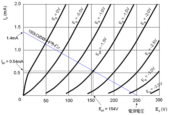 これで、次の図のように、EpとIpが250Vと0mAの点と、0Vと1.4mAの点を結んだロードラインが描ける。バイアスの決定は、このロードラインと曲線群のどの交点を使うかという問題になる。