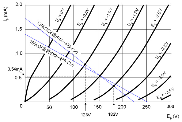| 12AX7の負荷抵抗180kΩのロードライン |