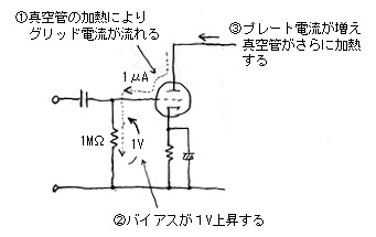 例えば、1μA(1mAの1/1000)の電流が流れ、グリッドリーク抵抗が1MΩだとすると1Vの電圧を発生するが、これはけっこう大きい電圧で、バイアスの電圧を持ち上げる。バイアス電圧が高くなるとプレート電流は増加する。すると真空管は熱を発し、グリッドリーク電流が1μAより増えて行く。これが繰り返されるとプレート電流は増加し続け、最終的には暴走してしまうのである。これが真空管の熱暴走と呼ばれるものである。