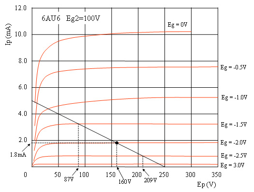 | 6AU6の負荷抵抗50kΩのロードライン |