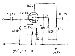 と計算できる。ロードラインで求めた値と違うが、まあまあ合っている。前の前の章で検討した高μの12AX7の時はゲインが59だったので、その倍ぐらいゲインが得られている。一般に、5極管を使った方が、3極管のときよりゲインを大きく取れると考えてもいいだろう。これで、結局、ロードラインから設計した6AU6の回路は下の図のようになった。