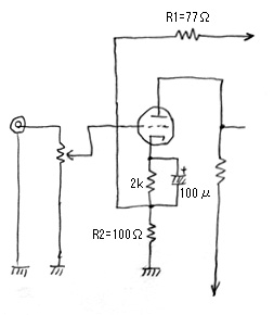 さて、この例の回路の初段はNFBをかけるためにバイパスコンデンサを入れることはできない。なので、初段では、必然的に電流帰還がかかってしまい、ゲインが落ち、内部抵抗が上昇する(ここを参照のこと)。これを避けたいときは右の図のように、NFB用の抵抗を別にして、値を100Ωなどの小さな値にする。こうすれば初段のゲインをあまり落とさずにNFBがかけられる。このR2=100Ωで(10)式で計算するとNFB抵抗R1は77Ωになる。