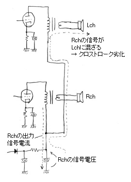 これを避けるには、Cを巨大にしてインピーダンスを十分下げるのも一つの方法だが、下の右の図のようにLchとRchの間にもデカップリング回路を設けるのがふつうである。こうすることで、低域のクロストークはずいぶんと改善される。