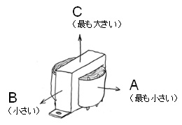 電源トランスの向きも重要である。今回使った図の(a)ようなトランスは伏型と呼ばれるタイプだが、この場合、AまたはBの方向が信号部分を向くようにする。一番悪いのはCの方向が信号部分を向いた場合である。実は、トランスに流れる交流電流が、トランスの回りに交流磁束というものをまき散らすのだが、その大きさがC→B→Aの順に大きいのである。この交流磁束が信号部分に入り込み、交流(関東なら50Hz、関西なら60Hz)の誘導ハムという「ブーン」というノイズを発生することがあるのだ。また、立型と呼ばれる(b)のようなトランスでは、A、B、Cは図のようになるので、AまたはBが信号方向を向くように配置する。