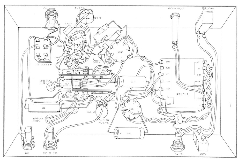 さて、以下は、すべて配線が終わったものをスケッチした実体配線図の完成形である。30年も昔の電子工作本には、すべての作例にこのような手描きの実体配線図が載っていたものである。今回、ちょっとそれを真似して描いてみた。